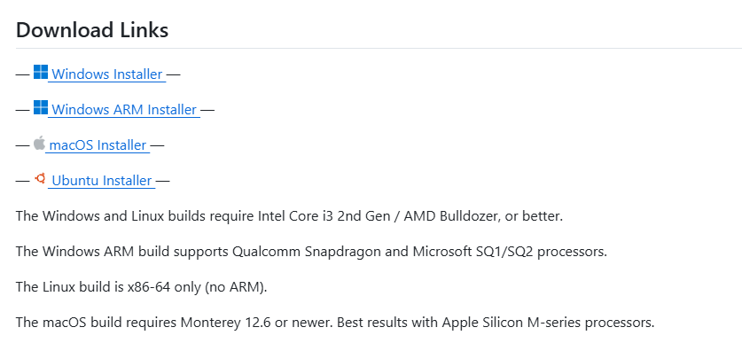 Alright then, now to download GPT4All from it’s github link. It might look a bit intimidating at first, but if you just scroll down a little in the github page, you’ll see this view: